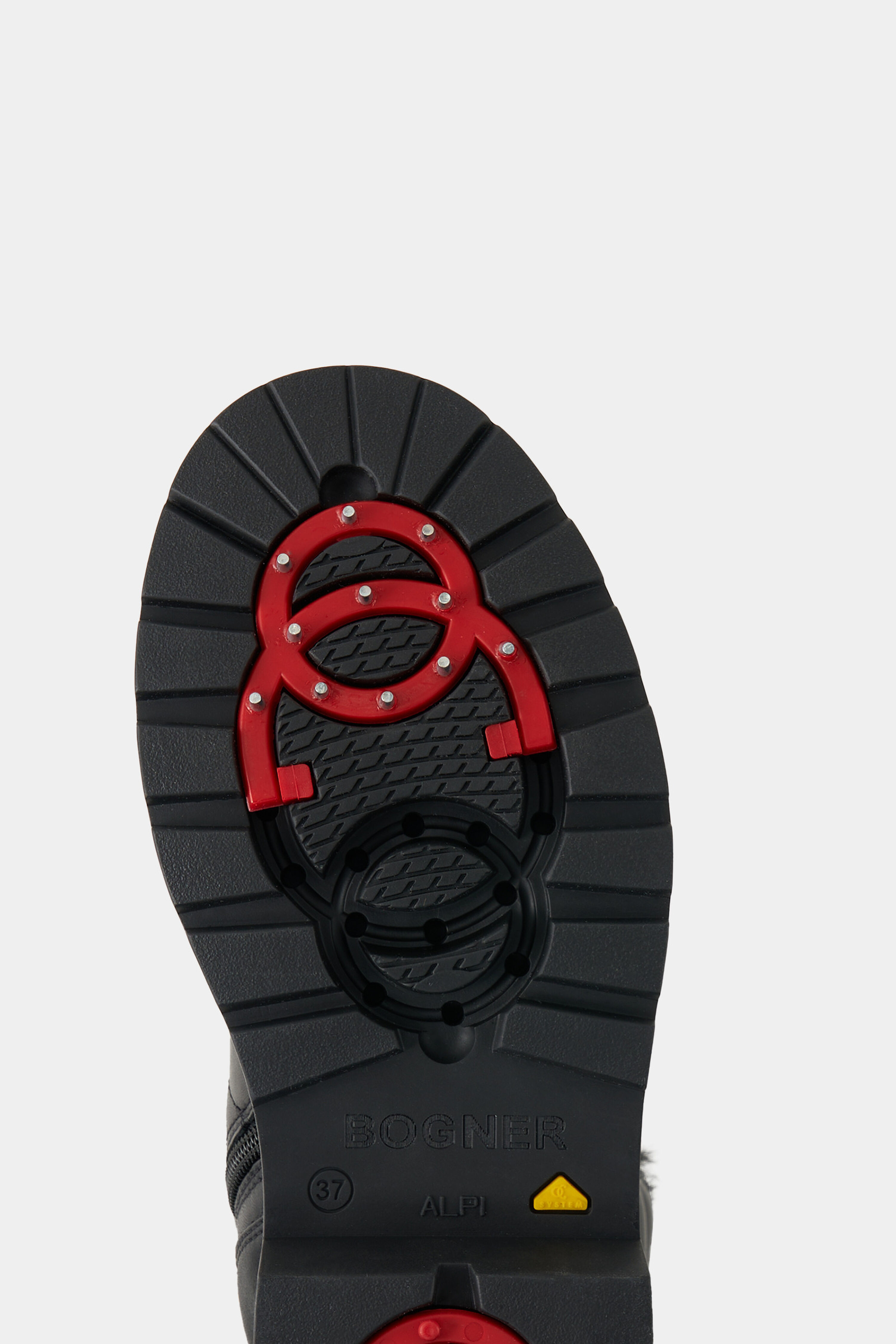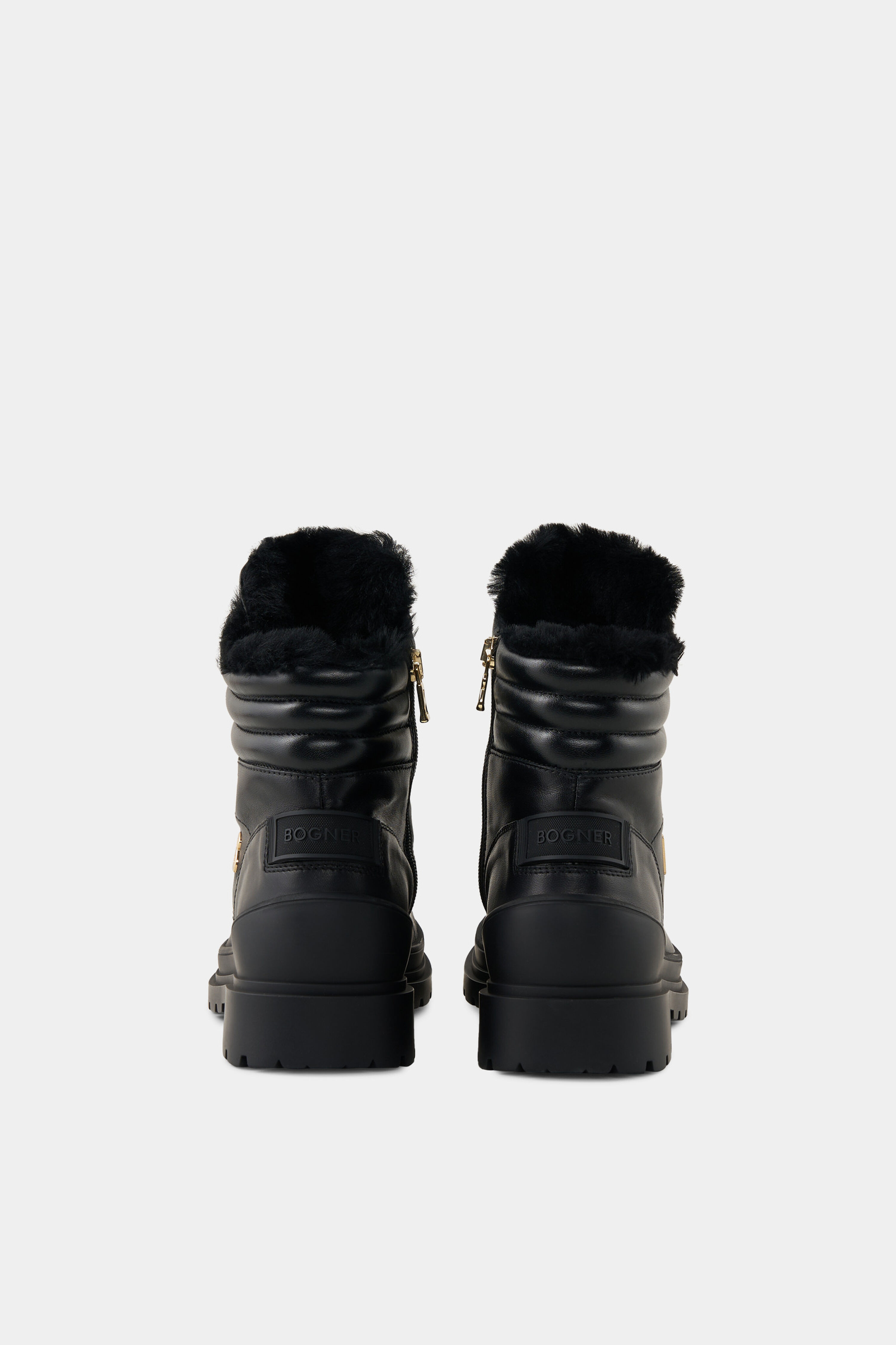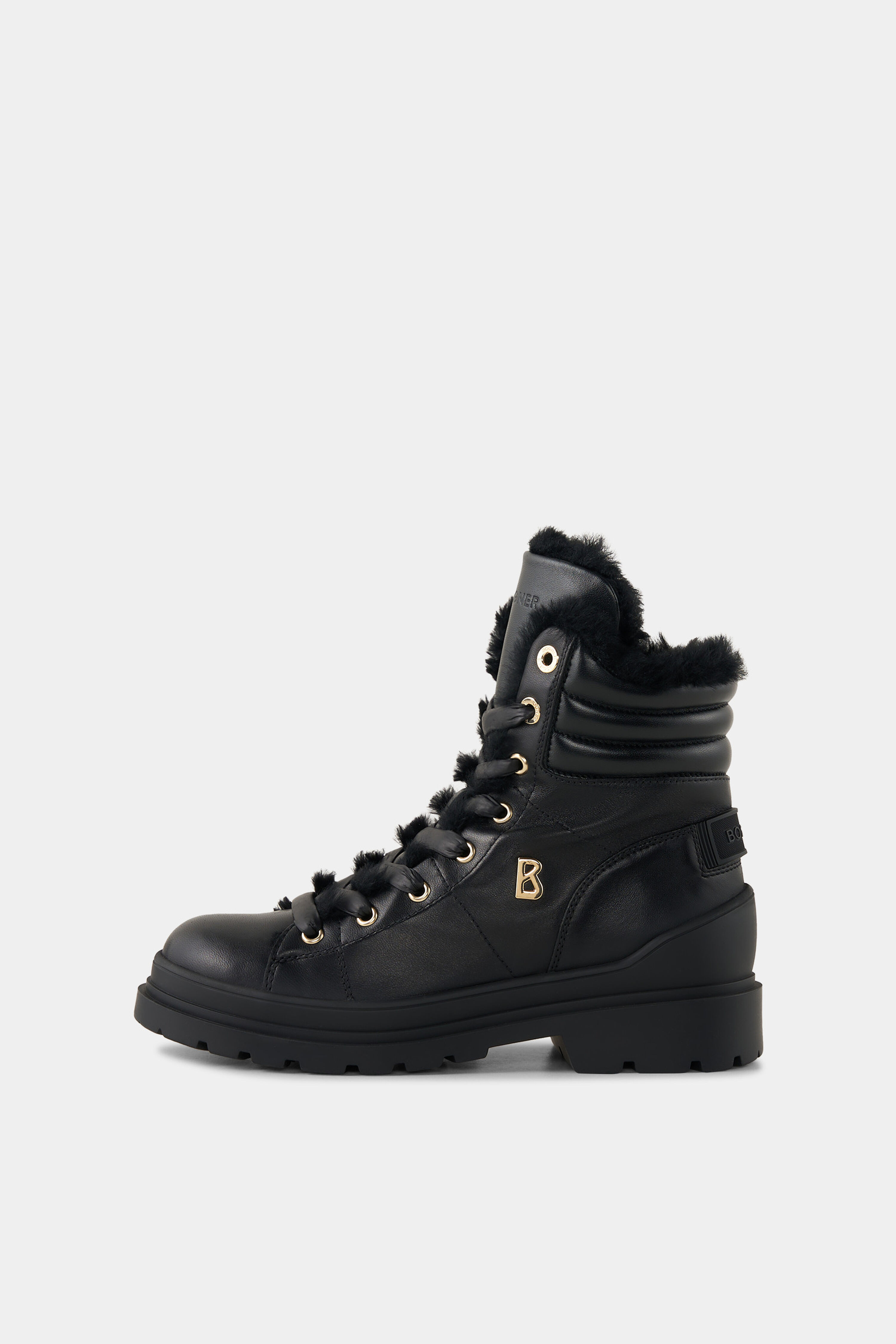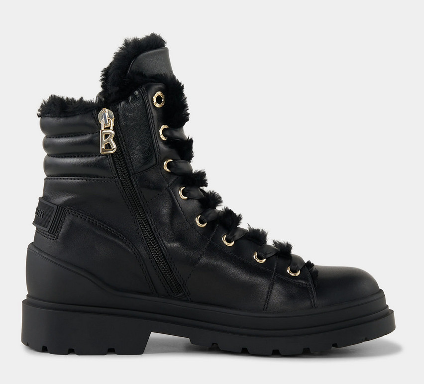 Luxusní obuv s gumovou podrážkou, koženým svrškem a hřejivou podšívkou z pravého beránka s vlnou (shearling). Kovové prvky ve zlatém provedení a elastické šněrování s očky dodávají botám Mid Boots St. Moritz z nappa kůže stylový vzhled, který doplňují prošívané detaily a luxusní vnitřní zpracování z jehněčí kůže. Integrované hroty zajišťují alpský styl a přilnavost na zmrzlém povrchu. Boty z nappa kůže s vložkou z jehněčí kůže Zapínání na boční zip s logem B Osminásobné šněrování s elastickými stahovacími pásky Středně vysoký svršek a zaoblená špička Boční aplikace B-Signé a logo na jazyku boty Gumová pata Vnitřní zpracování z jehněčí kůže Vyjímatelná stélka Výška svršku: 10 cm Šířka svršku: 8 cm Pryžová profilovaná podrážka Výklopné hroty pro bezpečnou přilnavost na sněhu Výška platforma (vpředu): 2 cm Výška podpatku (vzadu): 3 cm Včetně tašky na boty s logem Vyrobeno v Itálii