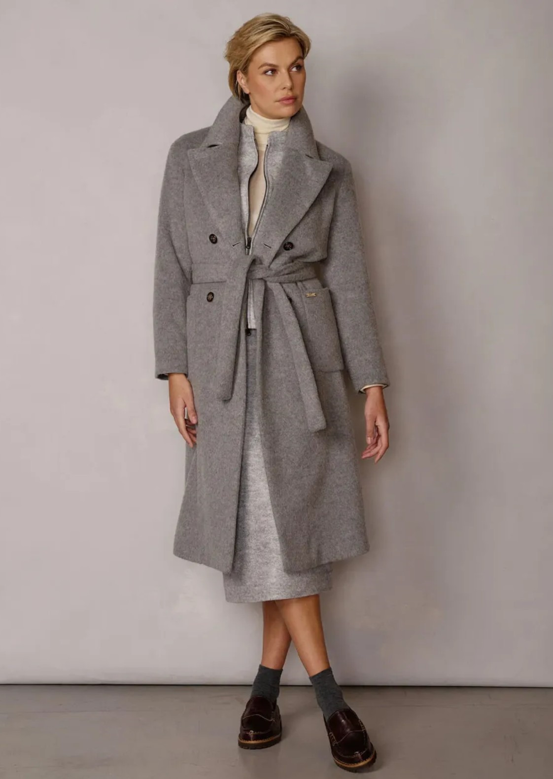 Kabát Lualissa z nadýchané vlněné směsi Tento podšitý kabát v pohodlném střihu s klopovým límcem, dvojitou knoflíkovou légou a páskem je z velké části vyroben z vlny, doplněné mohérem a nylonem. Luxusní tkanina, která pochází z Itálie, zaujme svým nesrovnatelně nadýchaným pocitem a kožešinovým efektem. Střih: pohodlný střih Límec: klopový límec Zapínání: dvouřadé zapínání na 2 knoflíky z organického rohu Kapsy: dvě našité kapsy Podšívka: Plně podšitý Původ: Tkanina z Itálie Zvláštnosti: Příjemně měkká tkanina s kožešinovým efektem, směs vlny s pepřovým vzorem jako kontrastní tkanina na vnitřní straně manžet, odnímatelný pásek na zavázání v pase, personalizovaná žakárová stuha jako věšák na kabát a logo z rohoviny na levé kapse Naše modelka Chantal je vysoká 177 cm a má italskou velikost 42. Složení: 62 % vlna, 23 % nylon, 10 % mohér, 5 % ostatní vlákna Aby vám váš nový oblíbený kousek dlouho vydržel, neperte ho, ale čistěte chemicky. Žehlete pouze na nízkou teplotu, nebělte a nesušte v sušičce. Před žehlením otočte naruby.