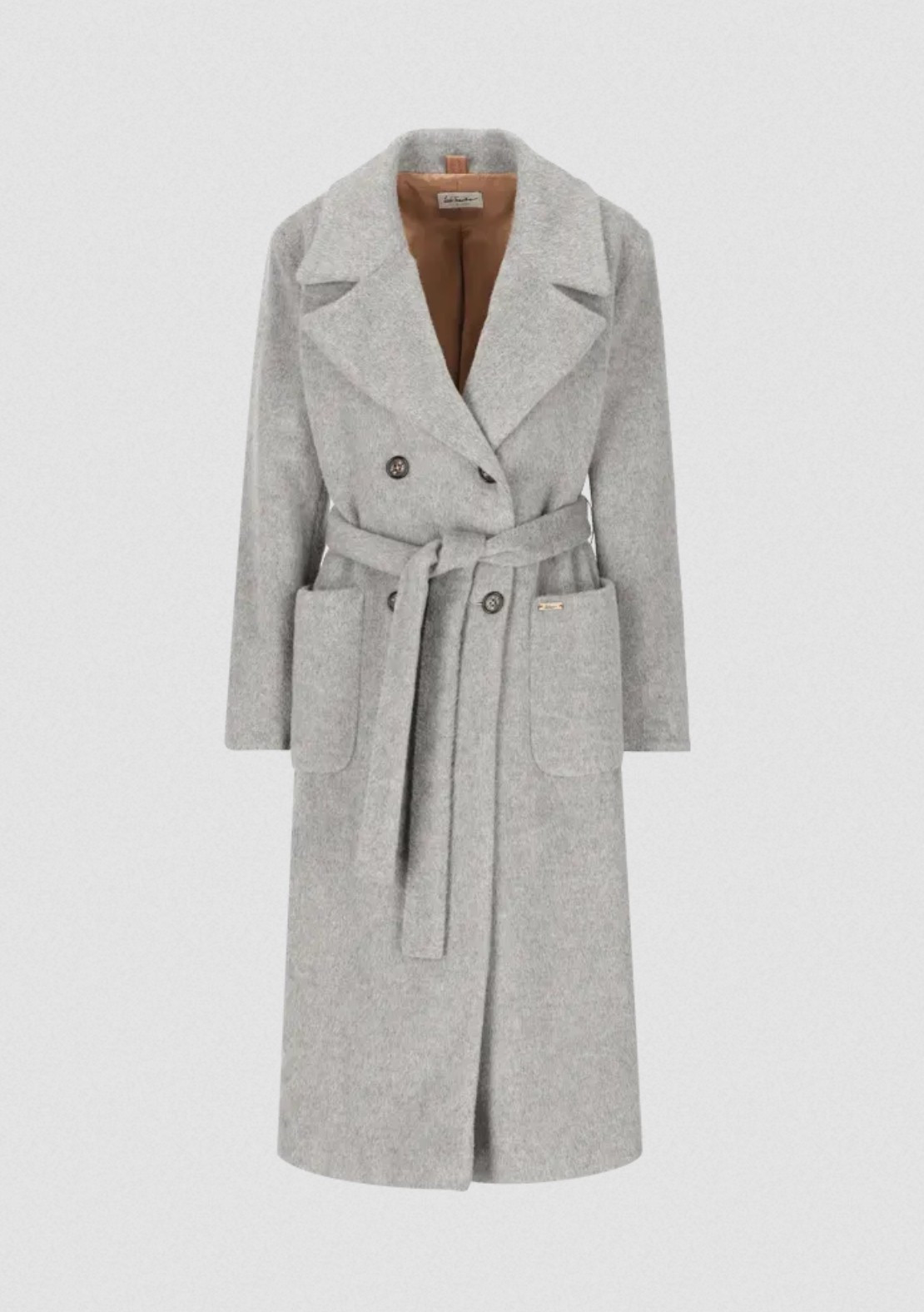 Tento podšitý kabát v pohodlném střihu s klopovým límcem, dvojitou knoflíkovou légou a páskem je z velké části vyroben z vlny, doplněné mohérem a nylonem. Luxusní tkanina, která pochází z Itálie, zaujme svým nesrovnatelně nadýchaným pocitem a kožešinovým efektem.