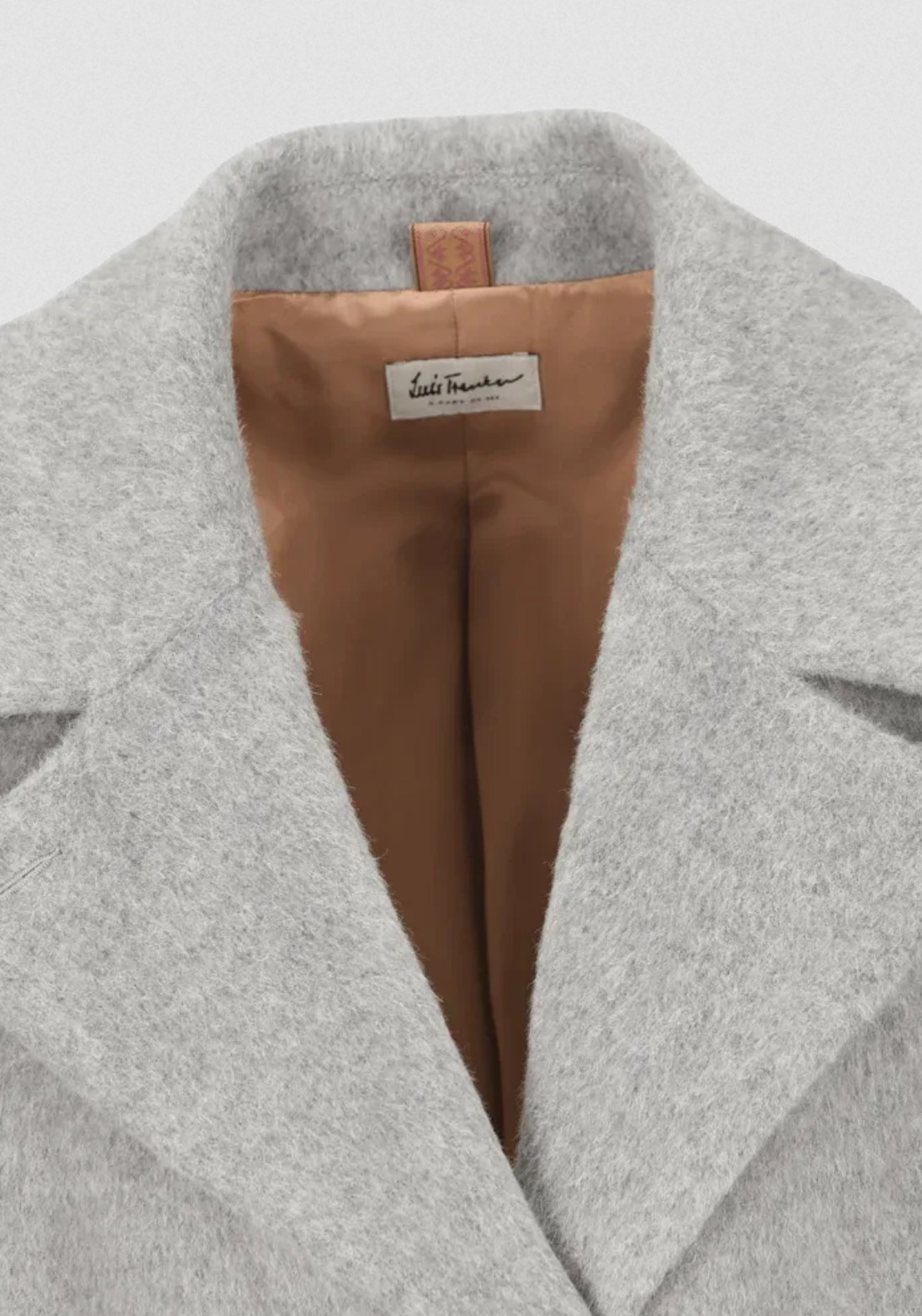 Zvláštnosti: Příjemně měkká tkanina s kožešinovým efektem, směs vlny s pepřovým vzorem jako kontrastní tkanina na vnitřní straně manžet, odnímatelný pásek na zavázání v pase, personalizovaná žakárová stuha jako věšák na kabát a logo z rohoviny na levé kapse