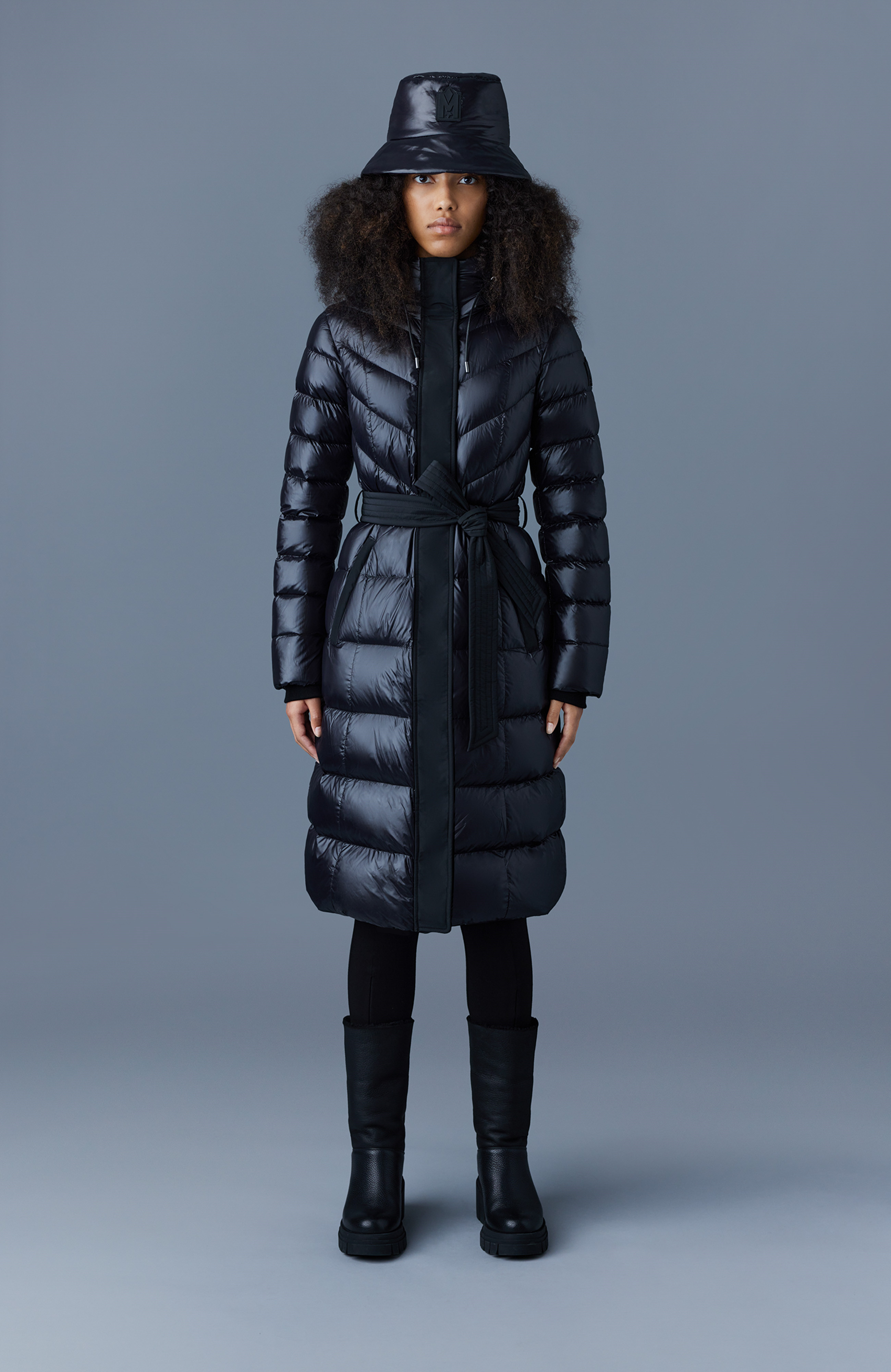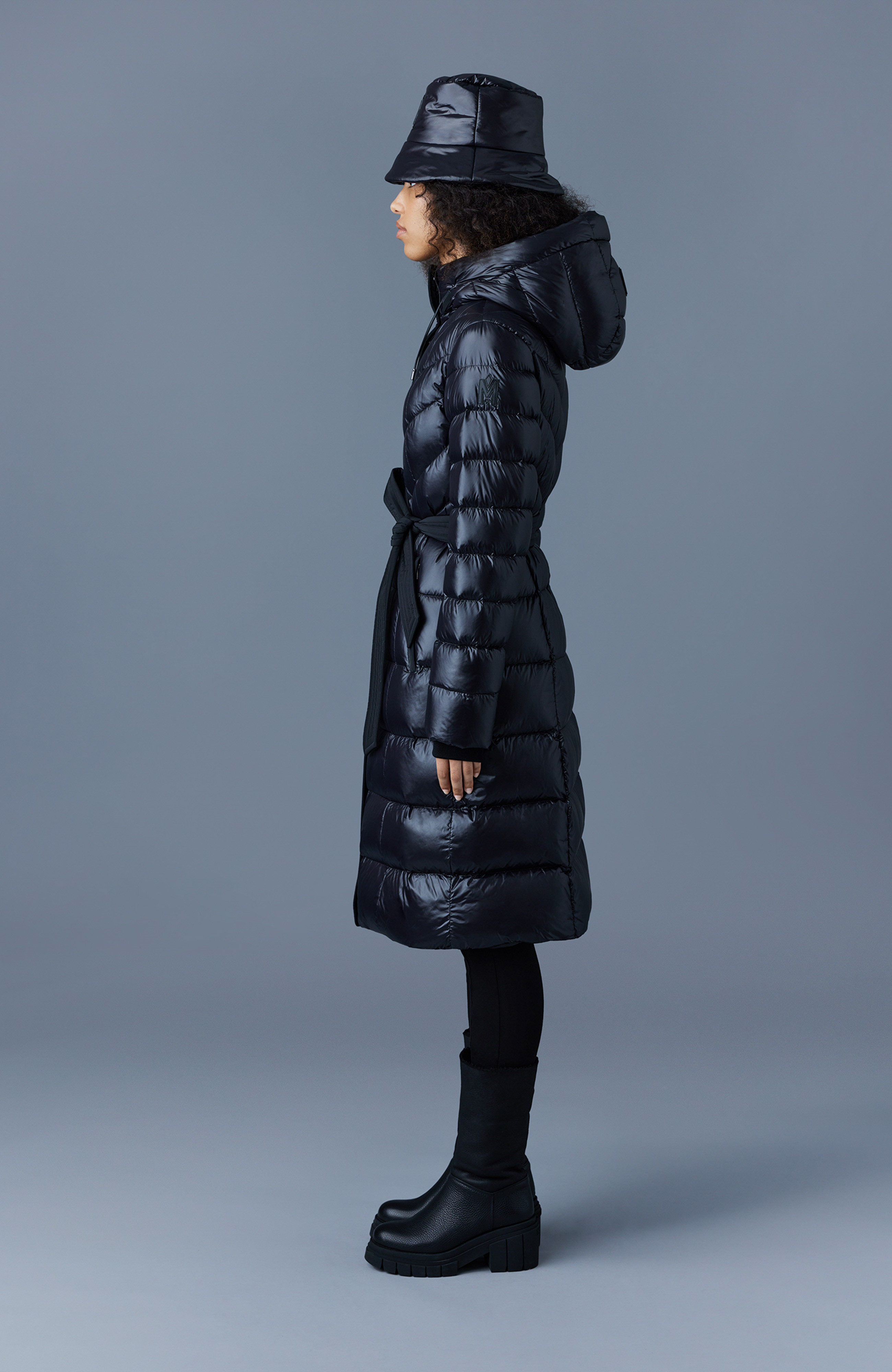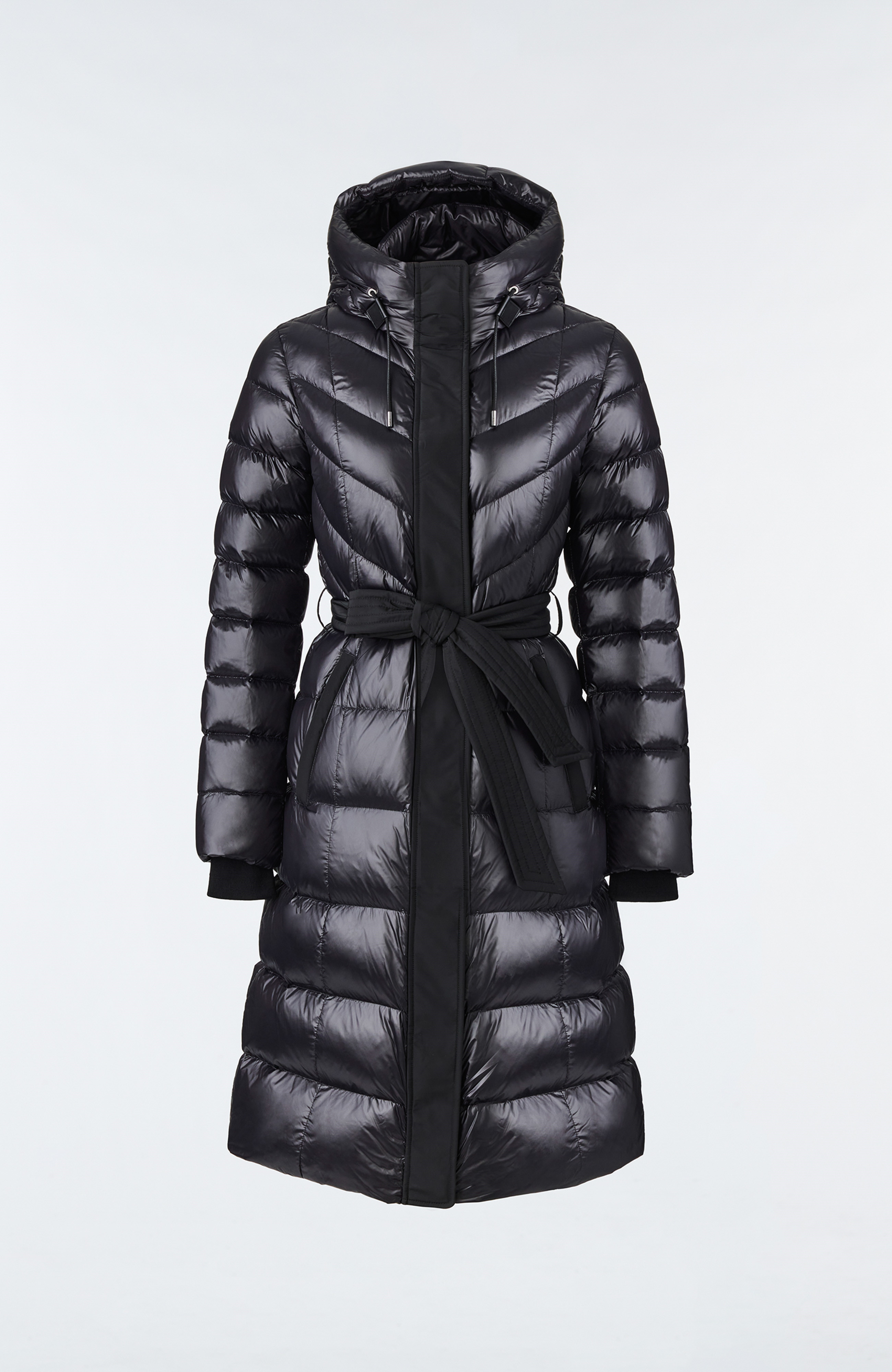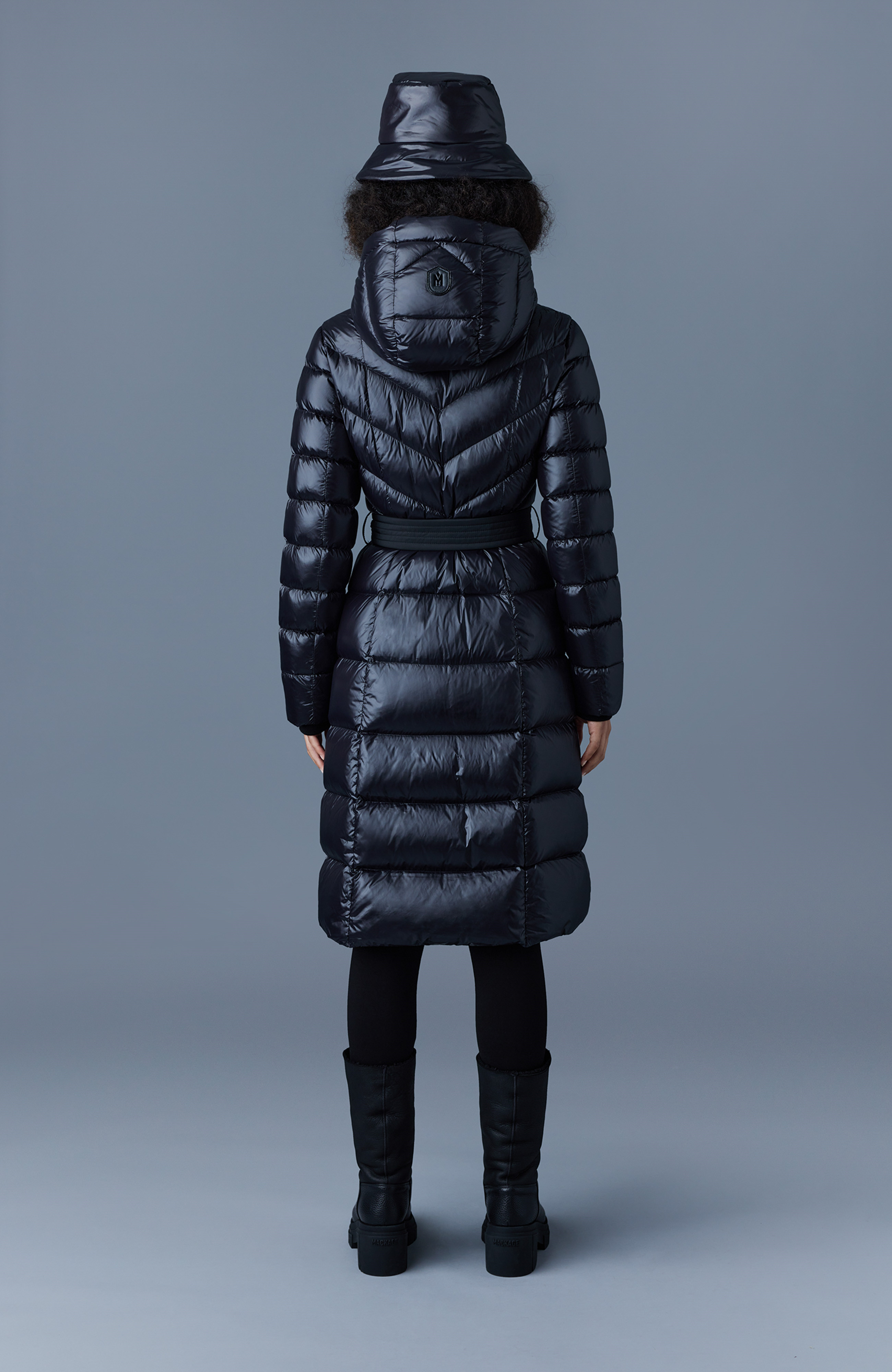 Mackage CORALIA je ultralehký dámský kabát s recyklovanou péřovou výplní, vybavený kapucí a páskem pro individuálně přizpůsobitelný komfort.