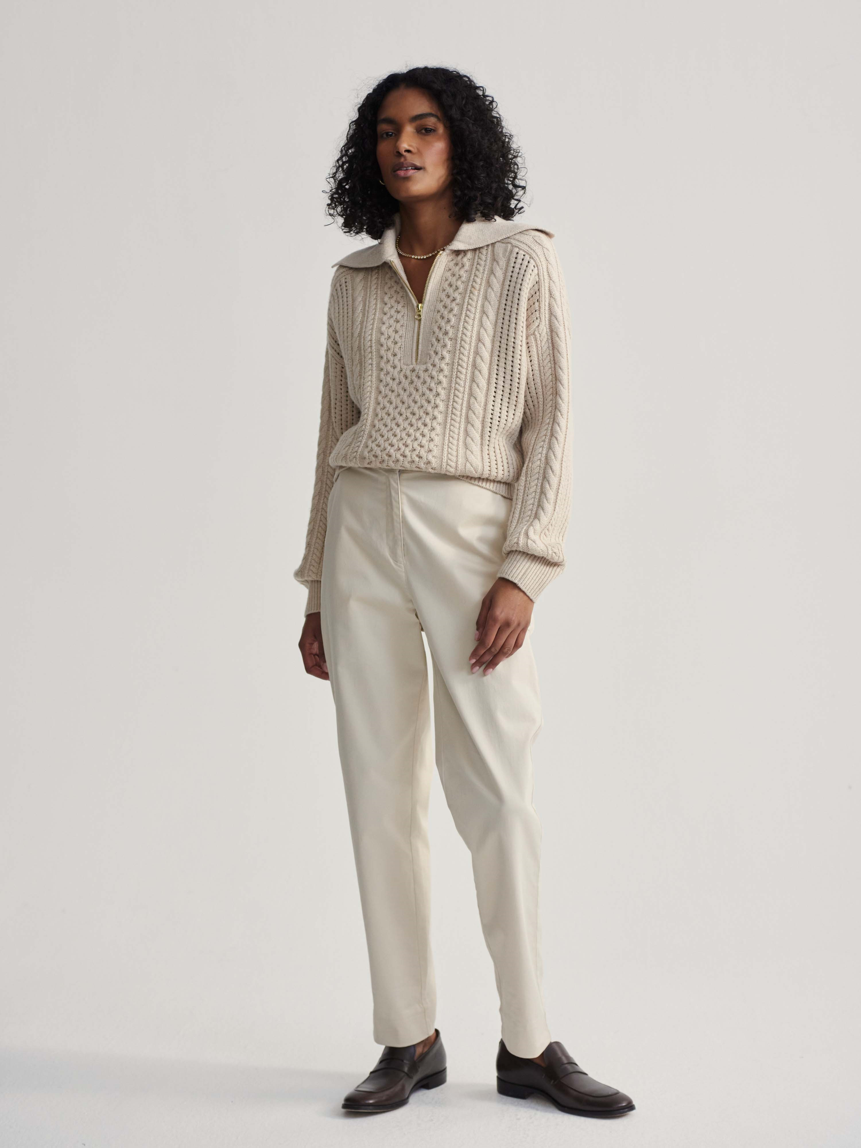 Camello má uvolněný střih s vysokým límcem, který ochrání krk. Polozip umožňuje přizpůsobení podle potřeb (otevřený pro větrání, zapnutý pro ochranu). Texturovaný copánkový vzor dodává vizuální hloubku. Elastické lemy na rukávech a spodním okraji zajišťují, že svetr drží tvar a příjemně přilne.